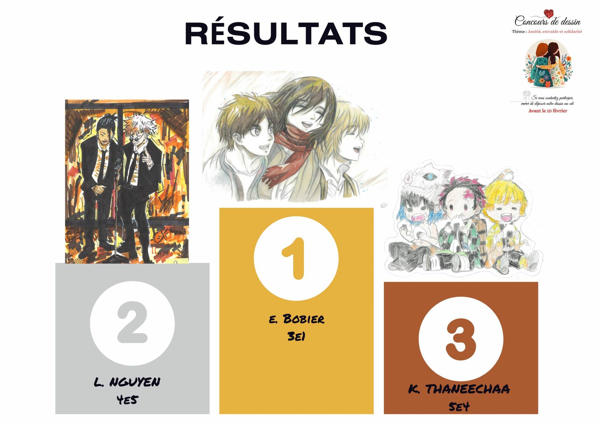 CONCOURS DE DESSINTHEME : AMITIE, ENTRAIDE ET SOLIDARITE Voici les gagnants : 1- Numéro 13 : Evan Bobier 3°1 avec 133 votes2-Numéro 9 : Lucas Nguyen 4°5 avec 87 votes3-Numéro 1 : Thaneechaa Kunalan 5°4 avec 85 votes Félicitations à eux !Bravo à tous les autres pour leur participation ! Mme LAZZERINICDI